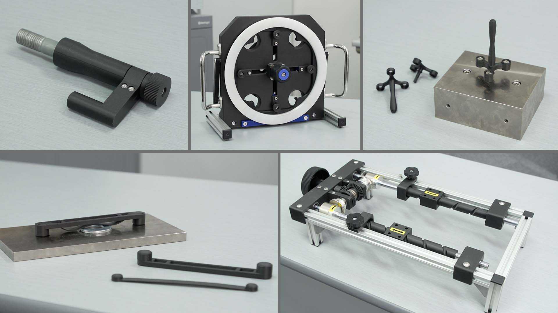 上段左から、大型部品深ザグリ穴ボルト外し工具、部品測定用治具、ボルト仮締め工具下段左から、ワーク押え、往復機構